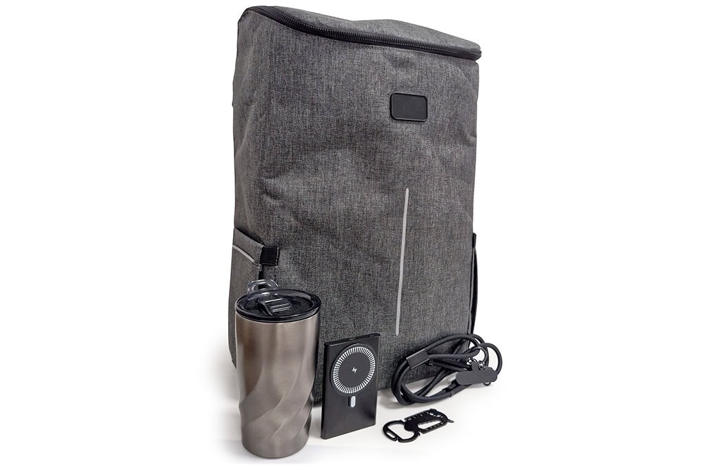 Specially designed for the holiday season, this gift set features a travel backpack, tumbler, power bank, charging cable, and multi-tool keychain. Delivered in a stylish presentation within the backpack itself, it shows employees and business partners that you value them. When personalized with your logo, these products keep your brand visible throughout the year.