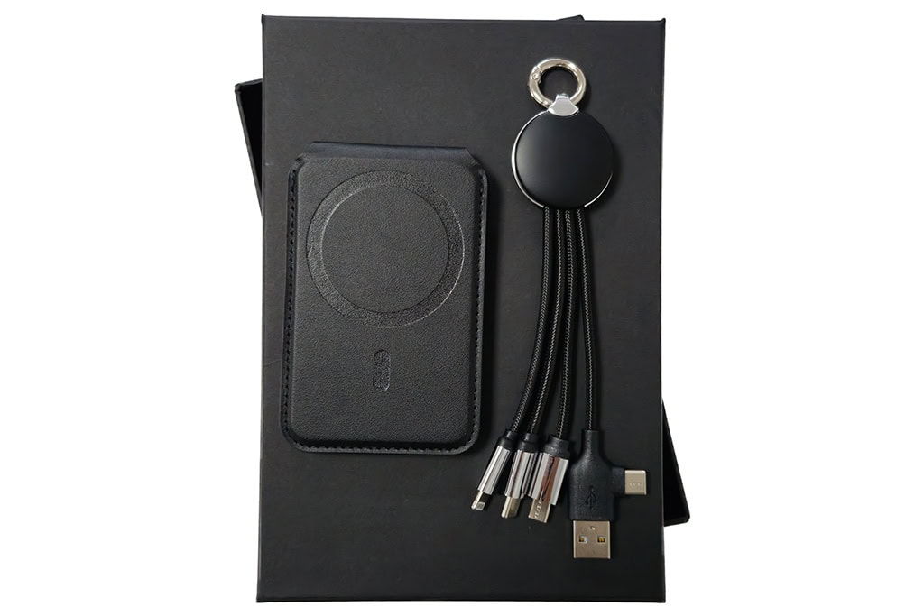 Focused on everyday phone accessories, this tech gift box offers the most used essentials. The MagSafe wallet provides a simple, practical way to carry cards and cash while remaining attached to the phone, keeping your logo always in sight. The multi-charging cable powers multiple devices quickly and securely, making it indispensable in daily life.